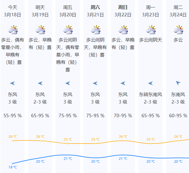 据“深圳天气”消息,深圳将告别前段时间的晴燥,暖意伴着湿气正缓缓上线。3月18-23日湿度逐渐加大,云量增多,天气渐转潮湿,间中有零星小雨,早晚有(轻)雾。