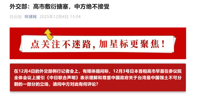 既然高市首相称日方在台湾问题上的基本立场如1972年《中日联合声明》所述,那么她能准确完整重申1972年《中日联合声明》所述的内容吗?