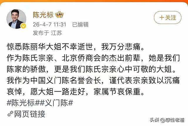 陈光标以宗亲名义悼念,初衷是表达对一位杰出女性、文化大家的敬意。无论是否同宗,对逝者的缅怀、对其贡献的认可,本是人之常情,这份善意不应被过度苛责。但问题在于,他以“陈氏宗亲”这一特定身份发声,就必须面对身份事实的检验——而公开资料清晰显示,陈丽华是满族正黄旗,叶赫那拉氏第八代后裔,“陈”是汉姓,并非汉族陈氏血脉。